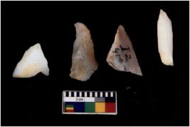 | Description / विवरण | There are n 4 flakes tool; there are flakes with sides trimmed, Marks of secondary flaking are present on the both the faces.The dorsal is relatively flat. One is pointed functional top. |
