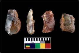 | Description / विवरण | There are n 4 utilized flake cores. There are multi directional irregular scar pattern on them. Three are tapering at one end and one has sharp edge. |