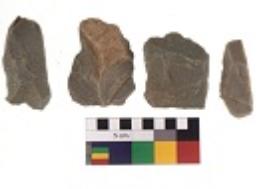 | Description / विवरण | There are n 4 utilized flake cores. There are multidirectional irregular dominant scar pattern on both dorsal and ventral face of the flake cores. Two are tapering at one end and two have sharp edges. |