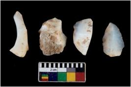 | Description / विवरण | There are n 4 utilized flake cores. There are multi directional irregular scar pattern on them. Two are tapering at one end and two have sharp edges. |