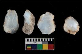 | Description / विवरण | There are n 4 utilized flake cores. There are multi directional irregular scar pattern on them. Three are tapering at one end and one has sharp edge. |