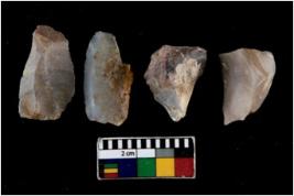 | Description / विवरण | There are n 4 utilized flake cores. There are multi directional irregular scar pattern on them. One is tapering at one end and three have sharp edges. |
