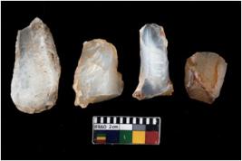 | Description / विवरण | There are n 4 ; worked utilized flakes; there are multidirectional irregular scar pattern on both dorsal and ventral face of the flakes. Two are tapering at one end. All are having sharp edges. |