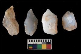 | Description / विवरण | There are n 4 utilized flake cores. There are multi directional irregular scar pattern on them. One is tapering at one end and three have sharp edges. |