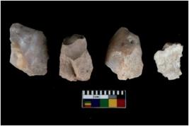| Description / विवरण | Specimen of flake tools with prominent flaking marks. They are made up of a short flakes with sides trimmed. |