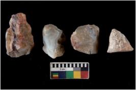 | Description / विवरण | There are n 4 utilized flake cores. There are multi directional irregular scar pattern on them. One is tapering at one end and three have blunted edges. |