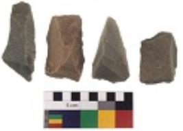 | Description / विवरण | There are n 4 utilized flake cores. There are multidirectional irregular dominant scar pattern on both dorsal and ventral face of the flake cores. Three are tapering at one end and one has sharp edges. |