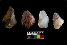 | Description / विवरण | There are n 4 ; worked utilized flakes; there are multidirectional irregular scar pattern on both dorsal and ventral face of the flakes. Three are tapering at one end. All are having sharp edges. |
