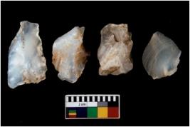 | Description / विवरण | There are n 4 ; worked utilized flakes; there are multidirectional irregular scar pattern on both dorsal and ventral face of the flakes. Three are tapering at one end. All are having sharp edges. |