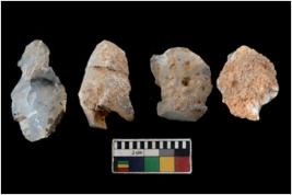 | Description / विवरण | There are n 4 utilized flake cores. There are multi directional irregular scar pattern on them. Two are tapering at one end and two have blunted edges. |
