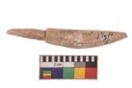 | Description / विवरण | Specimen having smooth surface and honey-brown in colour. Straight, one truncated end, biconical body with a comparatively thinner conical tang and broad oval in section. |