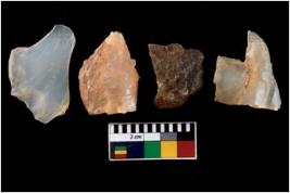 | Description / विवरण | There are n 4 ; worked utilized flakes; there are multidirectional irregular scar pattern on both dorsal and ventral face of the flakes. Three are tapering at one end. All are having sharp edges. |