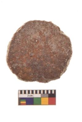 | Description / विवरण | Specimen of ground disc hopscotch made from a red ware. It has jagged edges with sign of chipping. It is rounded in shape. |