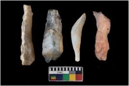 | Description / विवरण | There are n 4 utilized flake cores. There are multi directional irregular scar pattern on them. Two are tapering at one end and two have sharp edges. |