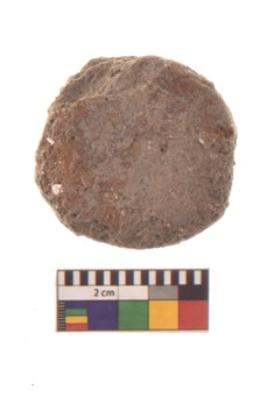 | Description / विवरण | Specimen of ground disc hopscotch made from a red ware. It has jagged edges with sign of chipping. It is rounded in shape. |