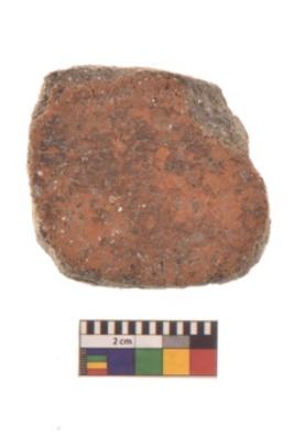 | Description / विवरण | Specimen of ground disc hopscotch made from a red ware. It has jagged edges with sign of chipping. It is rounded in shape. |