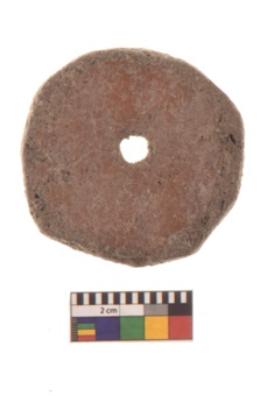 | Description / विवरण | Specimen of a complete specimen of terracotta perforated disc. It has eroded from the area around the perforation and diameter edge. The outer edge is even. It is wheel-made with well-levigated clay. It is quite light-weight. It is having smooth surface, redish in colour and well fired. |