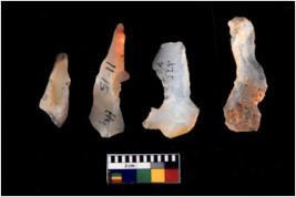 | Description / विवरण | There are n 4 flakes tool; there are flakes with sides trimmed, Marks of secondary flaking are present on the both the faces.The dorsal is relatively flat. One is pointed functional top. |