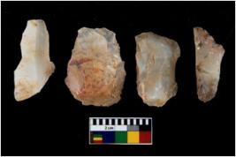 | Description / विवरण | There are n 4 utilized flake cores. There are multi directional irregular scar pattern on them. Three are tapering at one end and one has sharp edge. |