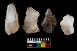 | Description / विवरण | There are n 4 ; worked utilized flakes; there are multidirectional irregular scar pattern on both dorsal and ventral face of the flakes. Two are tapering at one end. All are having sharp edges. |