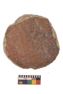 | Description / विवरण | Specimen of ground disc hopscotch made from a red ware. It has jagged edges with sign of chipping. It is rounded in shape. |