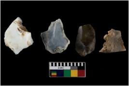 | Description / विवरण | There are n 4 ; worked utilized flakes; there are multidirectional irregular scar pattern on both dorsal and ventral face of the flakes. Two are tapering at one end whereas one is having a flat base. Three are having sharp edges. |