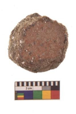 | Description / विवरण | Specimen of ground disc hopscotch made from a red ware. It has jagged edges with sign of chipping. It is rounded in shape. |