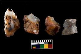 | Description / विवरण | There are n 4 ; worked utilized flakes; there are multidirectional irregular scar pattern on both dorsal and ventral face of the flakes. Two are tapering at one end whereas one is having a flat base. All are having sharp edges. |