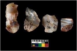 | Description / विवरण | There are n 4 ; worked utilized flakes; there are multidirectional irregular scar pattern on both dorsal and ventral face of the flakes. Two are tapering at one end. All are having sharp edges. |