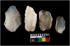 | Description / विवरण | There are n 4 ; worked utilized flakes; there are multidirectional irregular scar pattern on both dorsal and ventral face of the flakes. Two are tapering at one end. All are having sharp edges. |