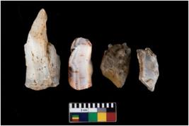 | Description / विवरण | There are n 4 ; worked utilized flakes; there are multidirectional irregular scar pattern on both dorsal and ventral face of the flakes. Two are tapering at one end. All are having sharp edges. |