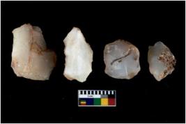 | Description / विवरण | There are n 4 utilized flake cores. There are multi directional irregular scar pattern on them. Two are tapering at one end and two have blunted edges. |