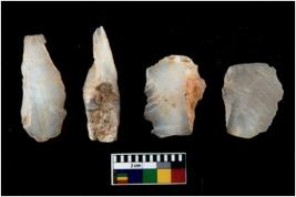 | Description / विवरण | There are n 4 utilized flake cores. There are multi directional irregular scar pattern on them. Three are tapering at one end and one has sharp edge. |