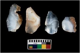 | Description / विवरण | There are n 4 ; worked utilized flakes; there are multidirectional irregular scar pattern on both dorsal and ventral face of the flakes. Two are tapering at one end. All are having sharp edges. |