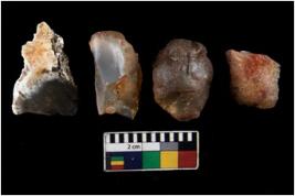 | Description / विवरण | There are n 4 ; worked utilized flakes; there are multidirectional irregular scar pattern on both dorsal and ventral face of the flakes. Two are tapering at one end. All are having sharp edges. |