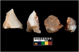 | Description / विवरण | There are n 4 ; worked utilized flakes; there are multidirectional irregular scar pattern on both dorsal and ventral face of the flakes. Two of them are tapering at one end with a point. All are having sharp edges. |