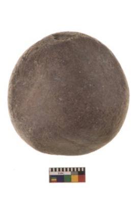 | Description / विवरण | Specimen of a hammer stone roughly rounded in shape with grounded edges and flattish base. |