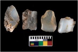 | Description / विवरण | There are n 4 ; worked utilized flakes; there are multidirectional irregular scar pattern on both dorsal and ventral face of the flakes. Two of them are tapering at one end and two are having flat base. All are having sharp edges. |