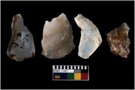 | Description / विवरण | There are n 4 ; worked utilized flakes; there are multidirectional irregular scar pattern on both dorsal and ventral face of the flakes. Three of them are tapering at one end. All are having sharp edges. |