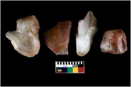 | Description / विवरण | There are n 4 ; worked utilized flakes; there are multidirectional irregular scar pattern on both dorsal and ventral face of the flakes. One of them are tapering at one end. All are having sharp edges. |