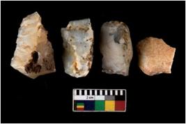 | Description / विवरण | There are n 4 ; worked utilized flakes; there are multidirectional irregular scar pattern on both dorsal and ventral face of the flakes. One of them are tapering at one end. All are having sharp edges. |