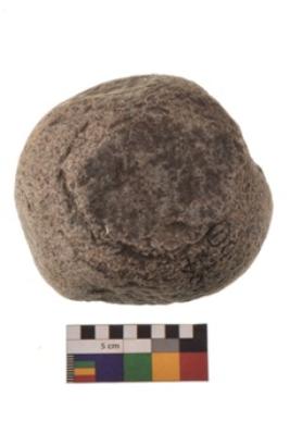 | Description / विवरण | Specimen of a hammer stone roughly rounded in shape with grounded edges and flattish base. |