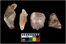 | Description / विवरण | There are n 4 utilized flake cores. There are multi directional irregular scar pattern on them. Three are tapering at one end and one has sharp edge. |