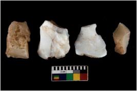 | Description / विवरण | There are n 4 ; worked utilized flakes; there are multidirectional irregular scar pattern on both dorsal and ventral face of the flakes.One of them are tapering at one end whereas two are having flat base. All are having sharp edges. |