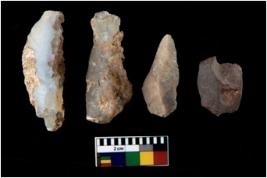| Description / विवरण | There are n 4 utilized flake cores. Out of them two are made up of Chert and two are made up of Chalcedony. There are multi directional irregular scar pattern on them. Two are tapering at one end and two have blunted edges. |