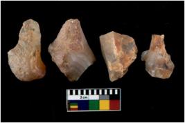 | Description / विवरण | There are n 4 utilized flake cores. There are multi directional irregular scar pattern on them. Three are tapering at one end and one has sharp edge. |