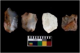 | Description / विवरण | There are n 4 ; worked utilized flakes; there are multidirectional irregular scar pattern on both dorsal and ventral face of the flakes. One of them are tapering at one end. All are having sharp edges. |