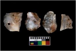 | Description / विवरण | There are n 4 ; worked utilized flakes; there are multidirectional irregular scar pattern on both dorsal and ventral face of the flakes. One of them are tapering at one end whereas one is having a flat base.. All are having sharp edges. |
