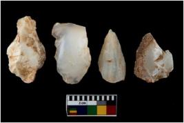 | Description / विवरण | There are n 4 utilized flake cores. There are multi directional irregular scar pattern on them. Two are tapering at one end and two have sharp edges. |