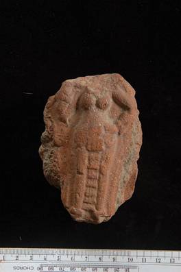 | Description / विवरण | Terracotta plaque showing on reverse side a headless female figure. On the over side a lady is seen in dancing posture close by a man is seen seated on a cushion and engaged in playing on a vina. Probably they are observing. |